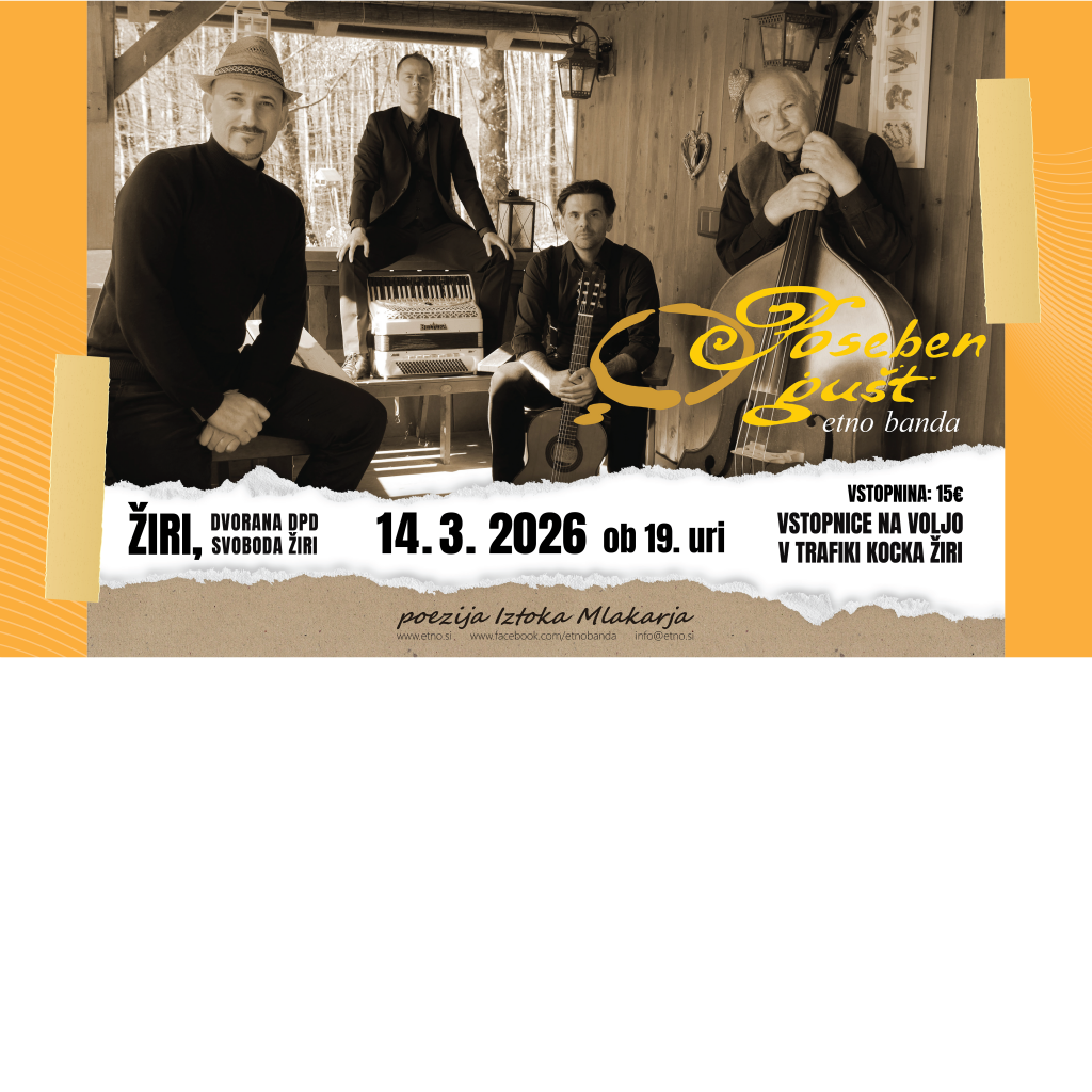 V Žiri prihaja poezija Iztoka Mlakarja v izvedbi skupine etno banda Poseben gušt. Kdaj? Sobota 14. marec 2026 v dvorani DPD Svoboda Žiri. Termin si kar rezervirajte, takega dogodka se pač ne sme zamuditi. Vstopnice so na voljo v trafiki Kocka v Žireh in neposredno na dan dogodka pred vstopom v dvorano, cena 15€